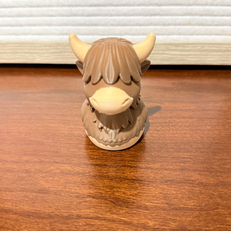 A quirky Highland cow + duck hybrid figurine—3D printed with adorable detail. Perfect for desks, shelves, and gift baskets.