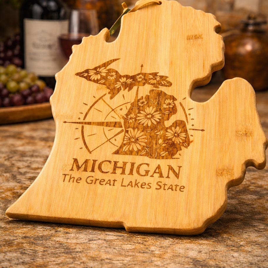 Celebrate Michigan pride with this beautifully laser-engraved, Michigan-shaped bamboo cutting board. Designed with intricate floral detailing, a compass rose, and the phrase âThe Great Lakes State,â this piece blends rustic charm with elegant craftsmanship.